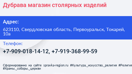 Дубрава, магазин столярных изделий по адресу 623110, Свердловская область, Первоуральск, Токарей, 10а в дальнейшем Организация, размещена в следующих категориях:
