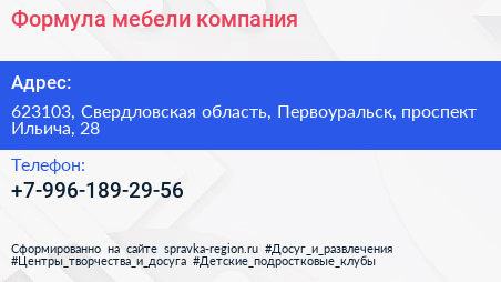 Формула мебели, компания по адресу 623103, Свердловская область, Первоуральск, проспект Ильича, 28 в дальнейшем Организация, размещена в следующих категориях: