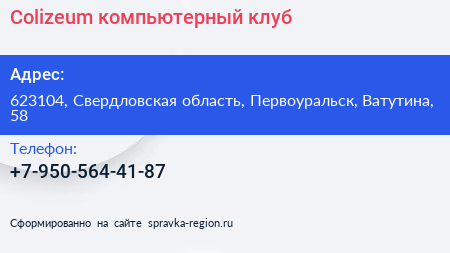 Colizeum, компьютерный клуб по адресу 623104, Свердловская область, Первоуральск, Ватутина, 58 в дальнейшем Организация, размещена в следующих категориях: