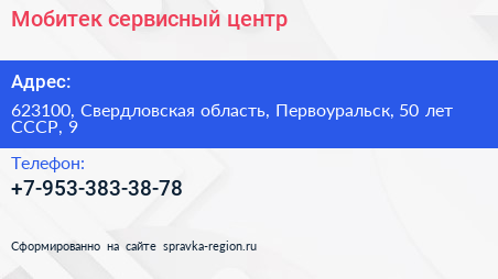 Мобитек, сервисный центр по адресу 623100, Свердловская область, Первоуральск, 50 лет СССР, 9 в дальнейшем Организация, размещена в следующих категориях: