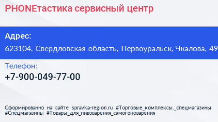 PHONEтастика, сервисный центр по адресу 623104, Свердловская область, Первоуральск, Чкалова, 49 в дальнейшем Организация, размещена в следующих категориях: