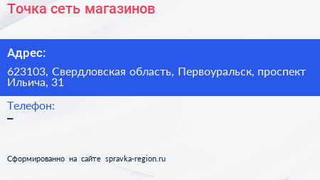 Точка, сеть магазинов по адресу 623103, Свердловская область, Первоуральск, проспект Ильича, 31 в дальнейшем Организация, размещена в следующих категориях: