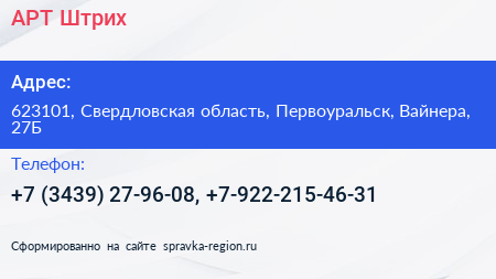 АРТ-Штрих по адресу 623101, Свердловская область, Первоуральск, Вайнера, 27Б в дальнейшем Организация, размещена в следующих категориях: