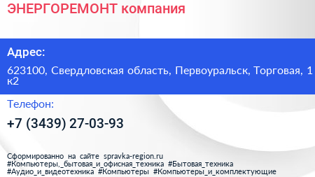ЭНЕРГОРЕМОНТ, компания по адресу 623100, Свердловская область, Первоуральск, Торговая, 1 к2 в дальнейшем Организация, размещена в следующих категориях: