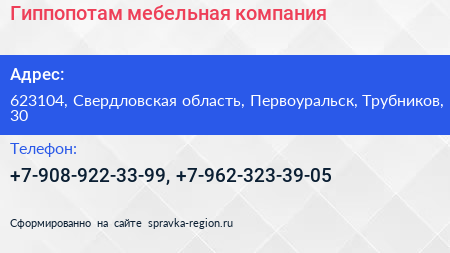 Гиппопотам, мебельная компания по адресу 623104, Свердловская область, Первоуральск, Трубников, 30 в дальнейшем Организация, размещена в следующих категориях: