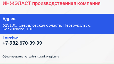ИНЖЭЛАСТ, производственная компания по адресу 623100, Свердловская область, Первоуральск, Белинского, 100 в дальнейшем Организация, размещена в следующих категориях: