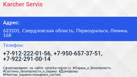 Karcher Servis по адресу 623101, Свердловская область, Первоуральск, Ленина, 168 в дальнейшем Организация, размещена в следующих категориях: