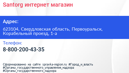 Santorg, интернет-магазин по адресу 623104, Свердловская область, Первоуральск, Корабельный проезд, 1-а в дальнейшем Организация, размещена в следующих категориях:
