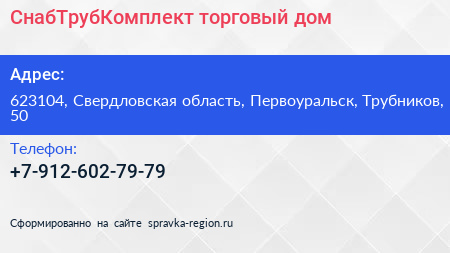 СнабТрубКомплект, торговый дом по адресу 623104, Свердловская область, Первоуральск, Трубников, 50 в дальнейшем Организация, размещена в следующих категориях: