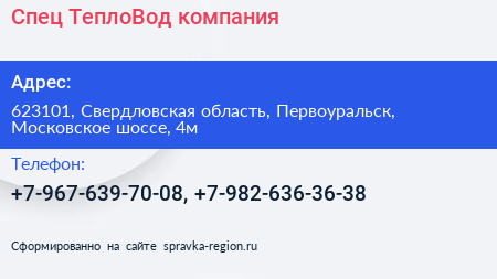 Спец ТеплоВод, компания по адресу 623101, Свердловская область, Первоуральск, Московское шоссе, 4м в дальнейшем Организация, размещена в следующих категориях: