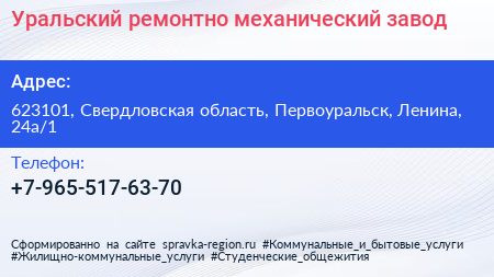 Уральский ремонтно-механический завод по адресу 623101, Свердловская область, Первоуральск, Ленина, 24а/1 в дальнейшем Организация, размещена в следующих категориях: