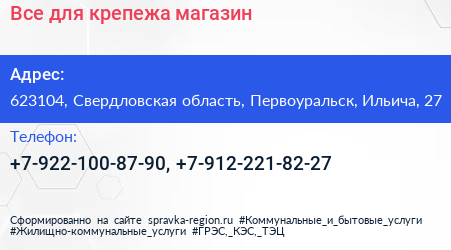 Все для крепежа, магазин по адресу 623104, Свердловская область, Первоуральск, Ильича, 27 в дальнейшем Организация, размещена в следующих категориях: