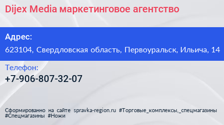 Dijex Media, маркетинговое агентство по адресу 623104, Свердловская область, Первоуральск, Ильича, 14 в дальнейшем Организация, размещена в следующих категориях: