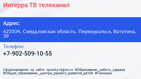 Интерра ТВ, телеканал по адресу 623104, Свердловская область, Первоуральск, Ватутина, 39 в дальнейшем Организация, размещена в следующих категориях: