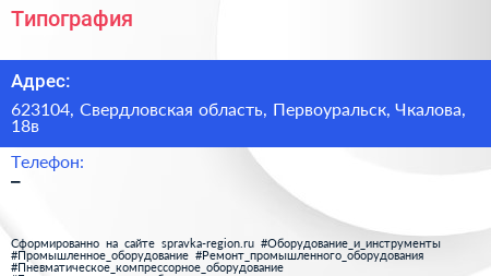 Типография по адресу 623104, Свердловская область, Первоуральск, Чкалова, 18в в дальнейшем Организация, размещена в следующих категориях: