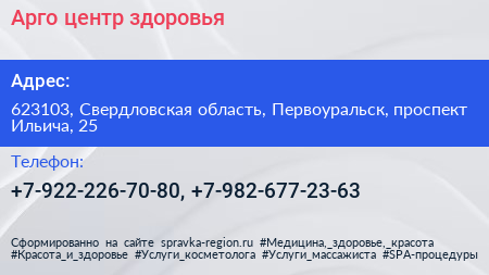 Арго, центр здоровья по адресу 623103, Свердловская область, Первоуральск, проспект Ильича, 25 в дальнейшем Организация, размещена в следующих категориях: