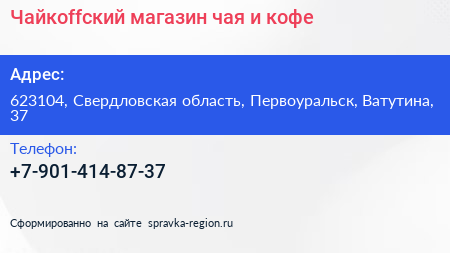 Чайкоffский, магазин чая и кофе по адресу 623104, Свердловская область, Первоуральск, Ватутина, 37 в дальнейшем Организация, размещена в следующих категориях: