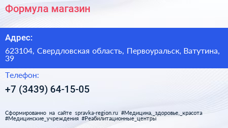 Формула, магазин по адресу 623104, Свердловская область, Первоуральск, Ватутина, 39 в дальнейшем Организация, размещена в следующих категориях: