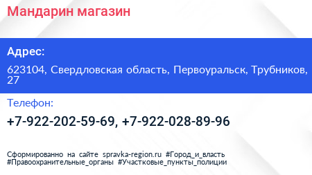 Мандарин, магазин по адресу 623104, Свердловская область, Первоуральск, Трубников, 27 в дальнейшем Организация, размещена в следующих категориях: