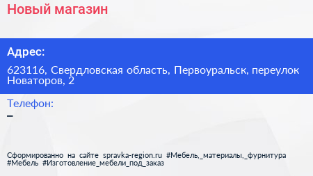 Новый, магазин по адресу 623116, Свердловская область, Первоуральск, переулок Новаторов, 2 в дальнейшем Организация, размещена в следующих категориях: