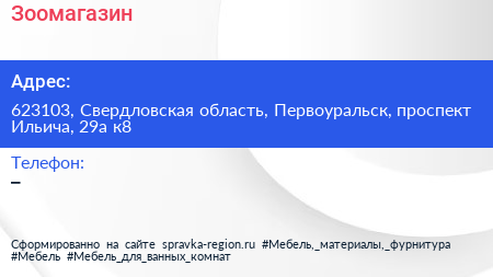 Зоомагазин по адресу 623103, Свердловская область, Первоуральск, проспект Ильича, 29а к8 в дальнейшем Организация, размещена в следующих категориях:
