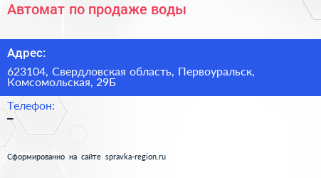 Автомат по продаже воды по адресу 623104, Свердловская область, Первоуральск, Комсомольская, 29Б в дальнейшем Организация, размещена в следующих категориях: