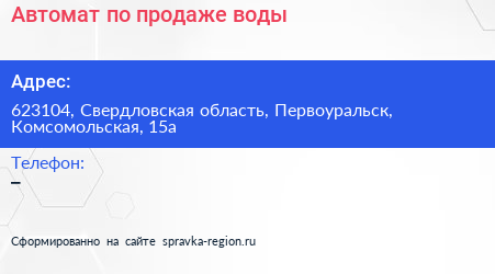 Автомат по продаже воды по адресу 623104, Свердловская область, Первоуральск, Комсомольская, 15а в дальнейшем Организация, размещена в следующих категориях: