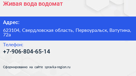 Живая вода, водомат по адресу 623104, Свердловская область, Первоуральск, Ватутина, 72а в дальнейшем Организация, размещена в следующих категориях: