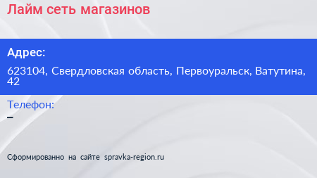 Лайм, сеть магазинов по адресу 623104, Свердловская область, Первоуральск, Ватутина, 42 в дальнейшем Организация, размещена в следующих категориях: