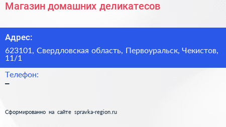 Магазин домашних деликатесов по адресу 623101, Свердловская область, Первоуральск, Чекистов, 11/1 в дальнейшем Организация, размещена в следующих категориях: