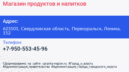 Магазин продуктов и напитков по адресу 623101, Свердловская область, Первоуральск, Ленина, 152 в дальнейшем Организация, размещена в следующих категориях: