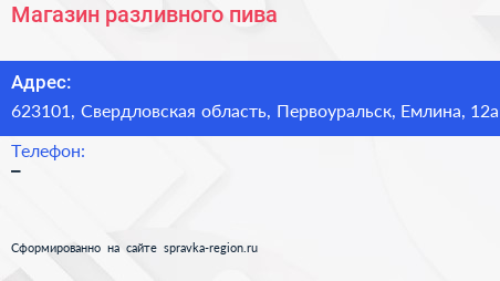 Магазин разливного пива по адресу 623101, Свердловская область, Первоуральск, Емлина, 12а в дальнейшем Организация, размещена в следующих категориях: