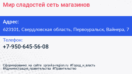 Мир сладостей, сеть магазинов по адресу 623101, Свердловская область, Первоуральск, Вайнера, 7 в дальнейшем Организация, размещена в следующих категориях: