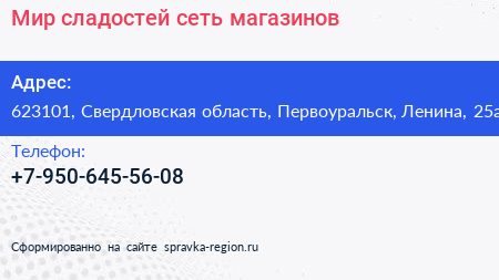 Мир сладостей, сеть магазинов по адресу 623101, Свердловская область, Первоуральск, Ленина, 25а в дальнейшем Организация, размещена в следующих категориях: