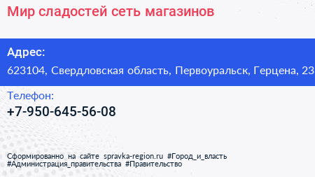 Мир сладостей, сеть магазинов по адресу 623104, Свердловская область, Первоуральск, Герцена, 23 в дальнейшем Организация, размещена в следующих категориях: