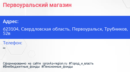 Первоуральский, магазин по адресу 623104, Свердловская область, Первоуральск, Трубников, 52в в дальнейшем Организация, размещена в следующих категориях: