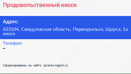 Продовольственный киоск по адресу 623104, Свердловская область, Первоуральск, Щорса, 1а киоск в дальнейшем Организация, размещена в следующих категориях: