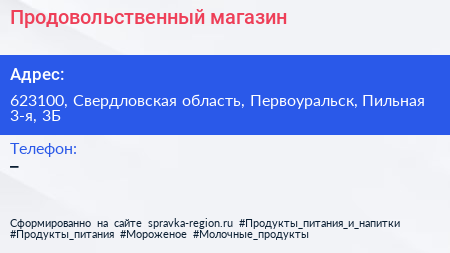 Продовольственный магазин по адресу 623100, Свердловская область, Первоуральск, Пильная 3-я, 3Б в дальнейшем Организация, размещена в следующих категориях: