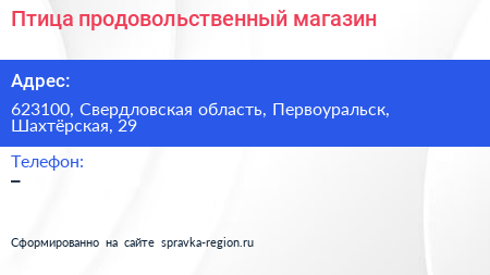 Птица, продовольственный магазин по адресу 623100, Свердловская область, Первоуральск, Шахтёрская, 29 в дальнейшем Организация, размещена в следующих категориях: