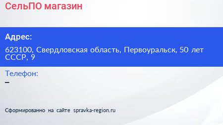 СельПО, магазин по адресу 623100, Свердловская область, Первоуральск, 50 лет СССР, 9 в дальнейшем Организация, размещена в следующих категориях: