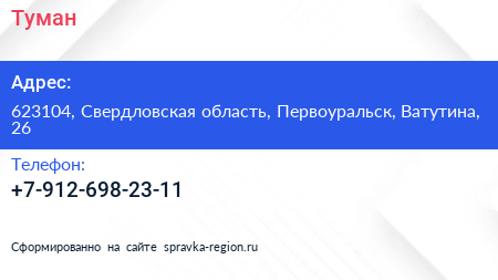Туман по адресу 623104, Свердловская область, Первоуральск, Ватутина, 26 в дальнейшем Организация, размещена в следующих категориях: