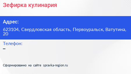 Зефирка, кулинария по адресу 623104, Свердловская область, Первоуральск, Ватутина, 20 в дальнейшем Организация, размещена в следующих категориях:
