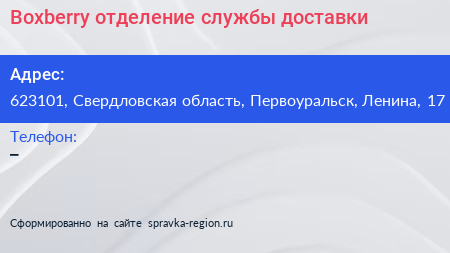 Boxberry, отделение службы доставки по адресу 623101, Свердловская область, Первоуральск, Ленина, 17 в дальнейшем Организация, размещена в следующих категориях: