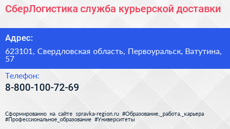 СберЛогистика, служба курьерской доставки по адресу 623101, Свердловская область, Первоуральск, Ватутина, 57 в дальнейшем Организация, размещена в следующих категориях: