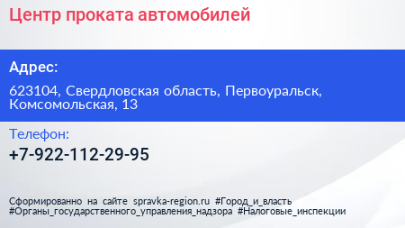 Центр проката автомобилей по адресу 623104, Свердловская область, Первоуральск, Комсомольская, 13 в дальнейшем Организация, размещена в следующих категориях: