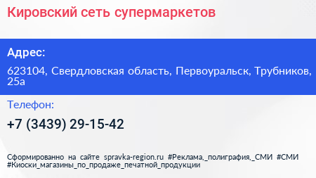 Кировский, сеть супермаркетов по адресу 623104, Свердловская область, Первоуральск, Трубников, 25а в дальнейшем Организация, размещена в следующих категориях: