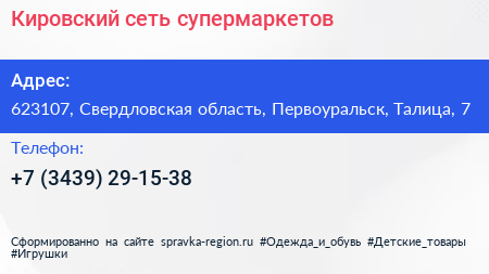 Кировский, сеть супермаркетов по адресу 623107, Свердловская область, Первоуральск, Талица, 7 в дальнейшем Организация, размещена в следующих категориях:
