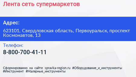 Лента, сеть супермаркетов по адресу 623101, Свердловская область, Первоуральск, проспект Космонавтов, 13 в дальнейшем Организация, размещена в следующих категориях: