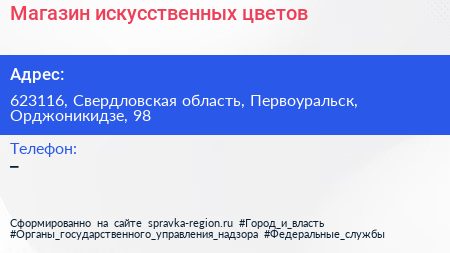 Магазин искусственных цветов по адресу 623116, Свердловская область, Первоуральск, Орджоникидзе, 98 в дальнейшем Организация, размещена в следующих категориях: