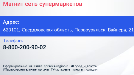 Магнит, сеть супермаркетов по адресу 623101, Свердловская область, Первоуральск, Вайнера, 21 в дальнейшем Организация, размещена в следующих категориях: